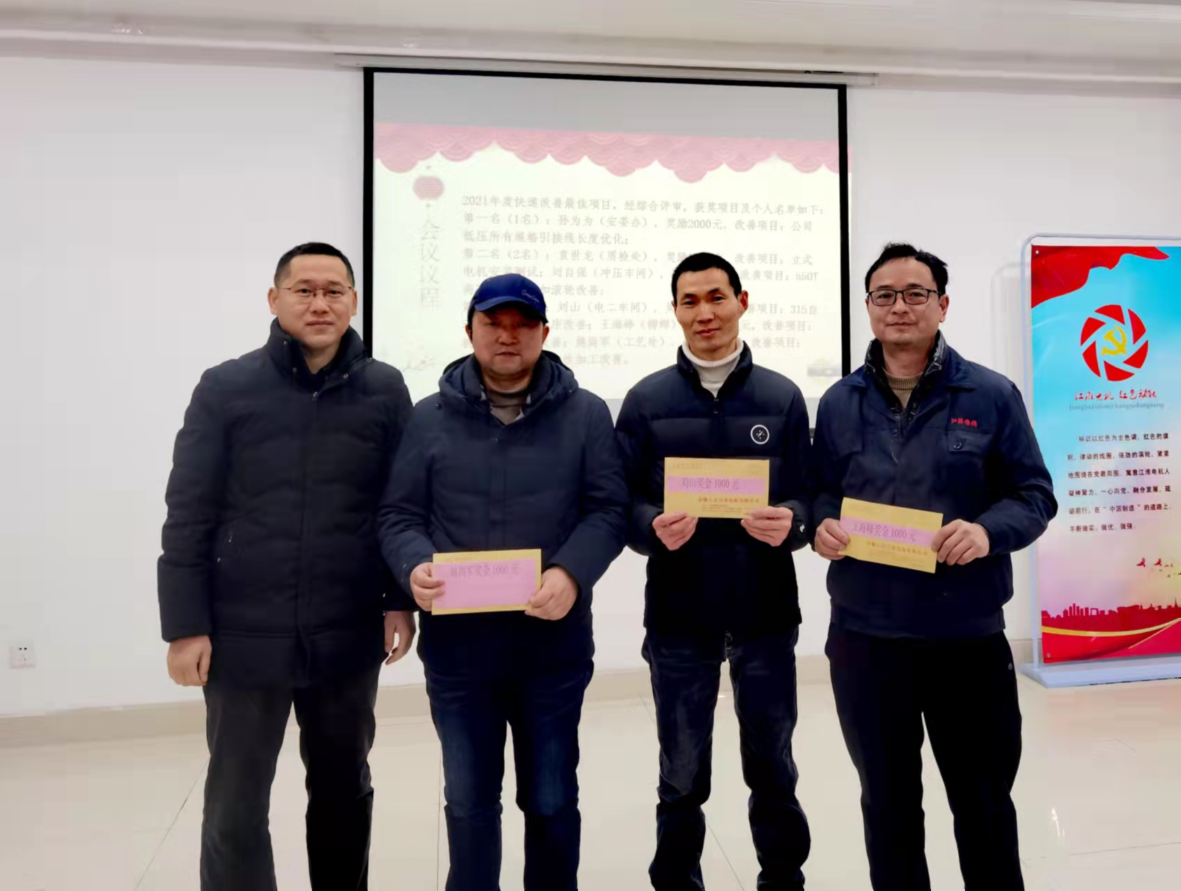 公司領(lǐng)導(dǎo)為獲獎人員頒獎 2021年度,技術(shù)部門產(chǎn)品研發(fā)成績突出,全年研發(fā)十大系列產(chǎn)品,產(chǎn)品技術(shù)不斷更新,技術(shù)資料不斷完善,取得了良好的成績,為公司妥善應(yīng)對變幻莫測的市場提供了有力的技術(shù)支持。特此,公司對技術(shù)處領(lǐng)頭人劉立漢、梁利、才慶龍各獎勵1萬元,給予技術(shù)研發(fā)人員程玉平、李靜靜、張瑜等16位同志共3.3萬元獎勵。 經(jīng)過一年來的收集及綜合評審,公司決定表現(xiàn)突出的單位給予 快速改善集體獎 第一名:金三車間 獎勵4000元 第二名:總二車間 獎勵2500元 第三名:鑄鋁車間 獎勵1500元 第一名:孫為為(安委辦),獎勵2000元,改善項目——公司低壓所有規(guī)格引接線長度優(yōu)化 第二名: 袁世龍(質(zhì)檢處),獎勵1500元,改善項目——立式電機安裝測試 劉自保(沖壓車間),獎勵1500元,改善項目——550T高速沖送料口加滾輪改善 第三名:劉 山(電二車間),獎勵1000元,改善項目——315自動嵌線機繞線工序改善: 王海峰(鉚焊車間),獎勵1000元,改善項目——機座拼焊校平改善; 姚尚軍(エ藝處),獎勵1000元,改善項目——H160-180端蓋一次性加工改善。 獲獎代表們紛紛表示,優(yōu)秀成績的取得是團隊團結(jié)一心,共同努力的結(jié)果。感謝公司提供的平臺和機遇,在以后的工作中必將再接再勵,勇創(chuàng)佳績。 表彰會上充分肯定了產(chǎn)品研發(fā)和快速改善工作,對獲獎?wù)弑磉_了祝賀,號召廣大干部職工在新的一年繼續(xù)再接再勵,團結(jié)一心,勇于拼搏,再創(chuàng)佳績。特別是要繼續(xù)大力推廣快速改善工作,讓這項工作成為給員工展示才能的舞臺,同時也提高公司管理水平。2022年公司將加大獎勵力度,持續(xù)給予大力支持,推進改善項目的全員參與度,激發(fā)員工的參與熱情,希望每一位江淮電機人能夠充分發(fā)揮才能,提出更好的快速改善項目。